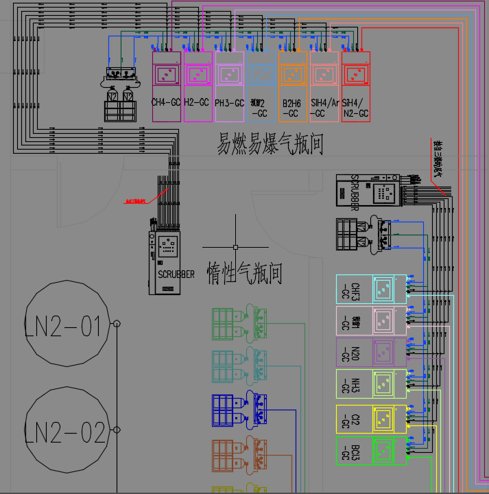 特氣系統(tǒng),尤其是集中供氣系統(tǒng)引入國(guó)內(nèi)的時(shí)間并不長(zhǎng),相應(yīng)的設(shè)備、施工方法、經(jīng)驗(yàn)多是從歐美等發(fā)達(dá)國(guó)家延伸而來(lái)。我們可以參考美國(guó)ASTM給出的相應(yīng)標(biāo)準(zhǔn),目前國(guó)內(nèi)標(biāo)準(zhǔn)也在逐步完善當(dāng)中。隨著半導(dǎo)體行業(yè)如火如荼的發(fā)展,越來(lái)越多的特氣設(shè)備也引入我們自己的生產(chǎn)線中,在多設(shè)備引入時(shí)建議不相容GR應(yīng)布置在不同房間里,當(dāng)由于條件所限布置在同一房間時(shí),GR之間的距離應(yīng)大于6M。同時(shí)具有可燃性和毒性的氣體設(shè)備應(yīng)該放置在可燃性氣體間。GR、GC、Scrubber等設(shè)備宜靠墻布置,具有相同性質(zhì)的設(shè)備應(yīng)該布置在一起。特種氣體房間內(nèi)的中間通道寬度不得小于2M。GC與墻體之間的距離宜大于0.1M,GC之間距離宜大于0.1M。各類設(shè)備布置應(yīng)該預(yù)留維修和運(yùn)轉(zhuǎn)空間。長(zhǎng)管拖車、ISO標(biāo)準(zhǔn)集裝瓶組等大型設(shè)備宜放置在室外空曠平地。