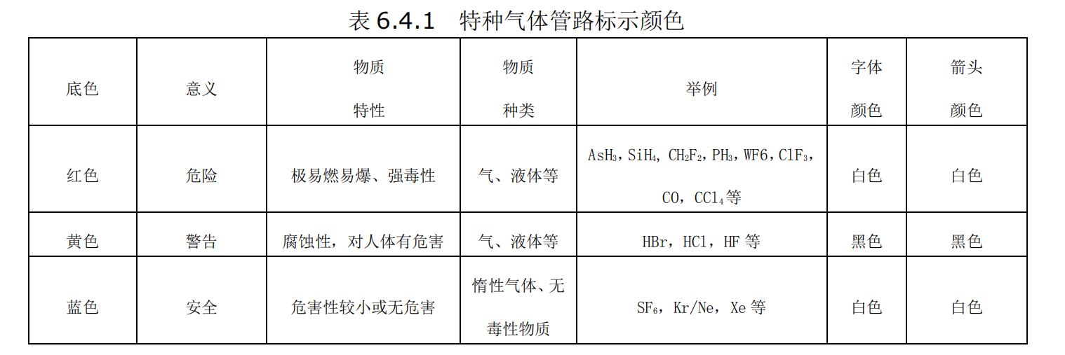 內(nèi)容摘要:特種氣體管道必須進(jìn)行管道標(biāo)識(shí),特氣管道應(yīng)以不同顏色、字體等標(biāo)識(shí)氣體名稱、主要危險(xiǎn)性和流向。